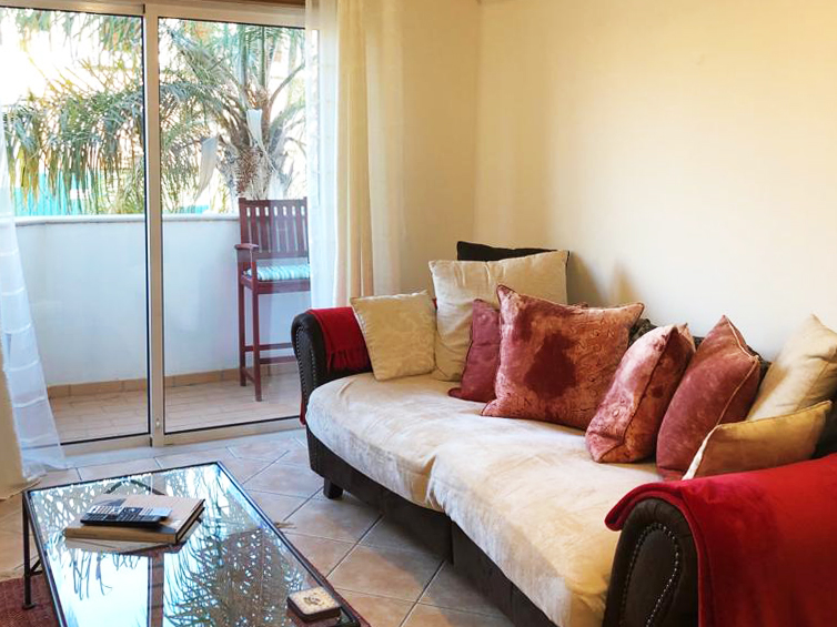 Bedroom one: Double bed with posture pedic mattress, fitted wardrobes, chest of draws with TV. Glass sliding doors lead out to a balcony with views over the pool. Air conditioning. There is a table and six chairs for “Alfresco “ dining. The en-suite bathroom has a jacuzzi bath with shower over, a basin and toilet.